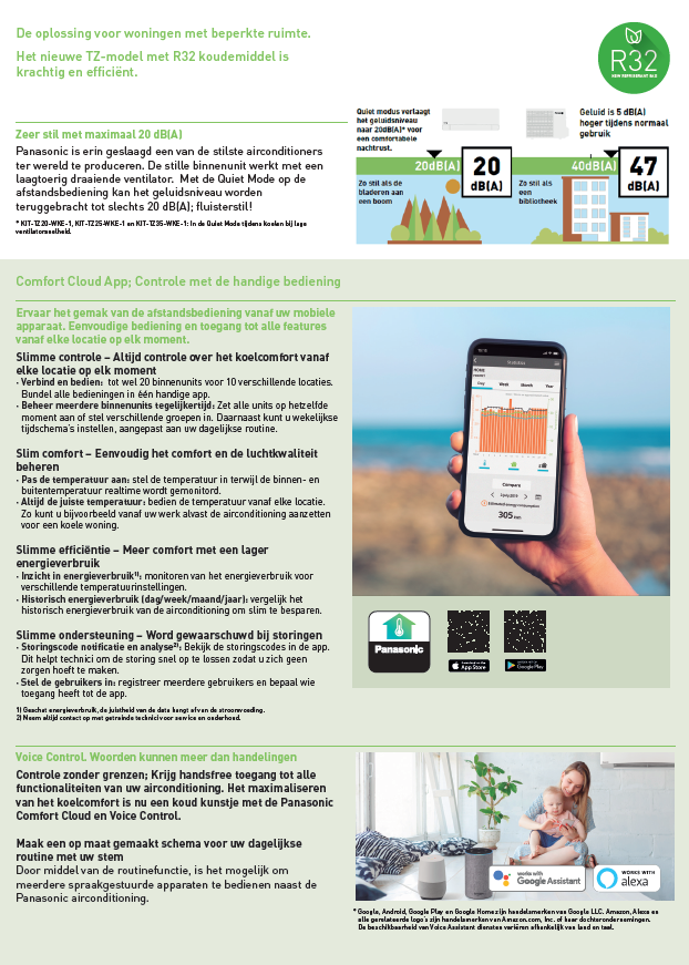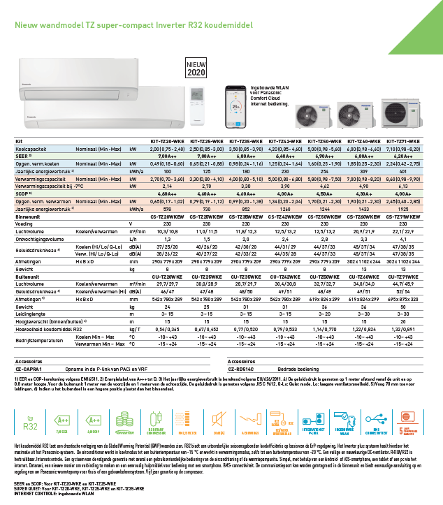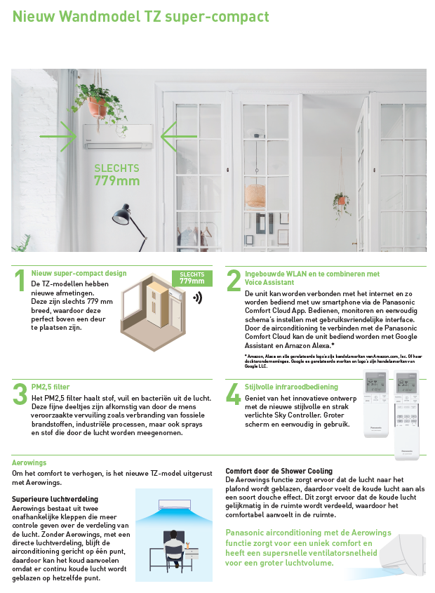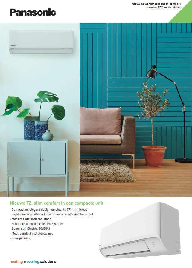 De nieuwe TZ inverter modellen hebben compacte afmetingen. Met een breedte van 799mm kunt u de airconditioner boven een deur plaatsen. De nieuwe TZ inverter modellen zijn krachtig en efficiënt en hebben energielabel A++/A++. De TZ werkt tot een buitentemperatuur van -15°C in verwarmingsmodus en -10°C in koelmodus met hoge efficiëntie. Samen met het PM2,5 filter en de stille werking maakt dit de TZ reeks een goede keuze in de compacte categorie.